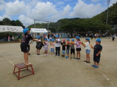 かごの上に置いた球を水でっぽうで撃ち落とします。小さい軽いものは簡単に落とせましたが、大きいものはなかなか…。勢いのある水でっぽうで落としていました。