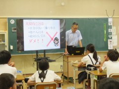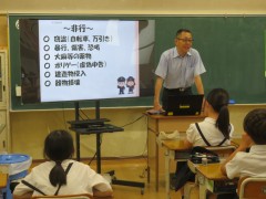6月19日(木)6年生を対象に、岸和田警察生活安全課少年係から警察官の方をゲストティーチャーにお招きして非行・犯罪被害防止教室を実施しました。万引き、暴行、いじめなどの犯罪や非行について、実例を交えてお話しいただきました。また、最近急激に増加しているSNSに関係する犯罪についても学習しました。岸和田の小学生にも起こった事例について話していただき、スマートフォンの利用の仕方、情報発信の仕方やネットモラルについても考えました。子どもたちもこんなに身近に、犯罪の危険があることを知り、驚いた様子で真剣に話を聞いていました。これから迎える夏休み、ご家庭でもスマートフォンの利用の仕方について約束を決め、事件に巻き込まれることのないように過ごしてほしいと思います。